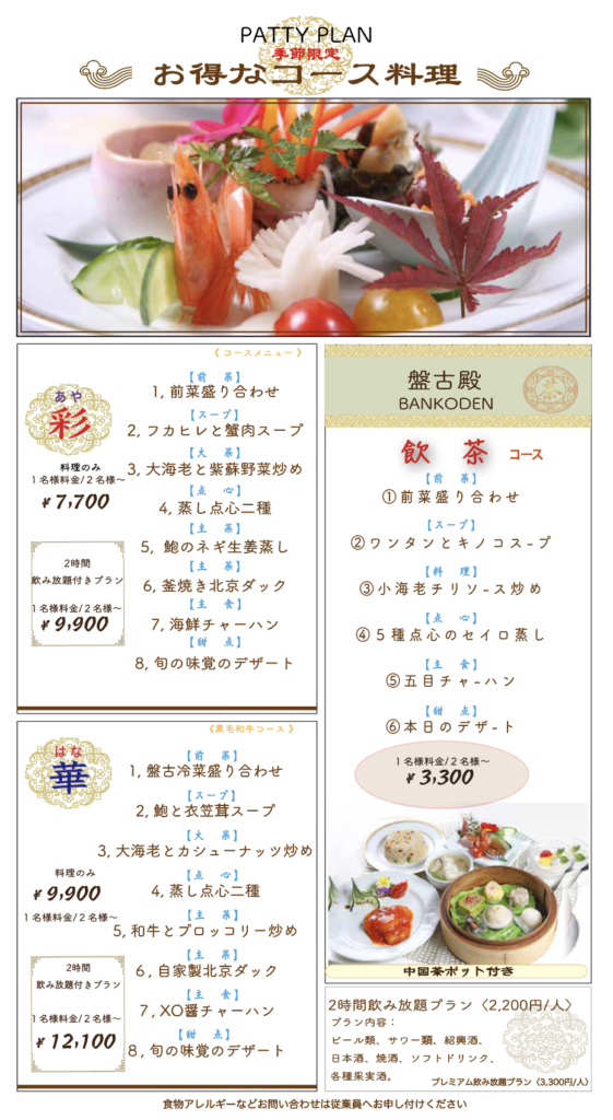 ■◇■ 期間限定:冬季限定の特別コース料理 ■◇■ 2025年12月01日(月)〜年末年始のご会食に相応しい華やかな中華会席《2名様より承ります》 実施店舗:盤古殿 新横浜プリンスホテル店 | 秋葉原UDX店 | コレド日本橋店|馬車道TERRACE店